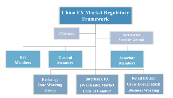 The China FX Market Self-Regulatory Framework has set up three working groups: the Exchange Rate Working Group, the Interbank FX (Wholesale) Market Code of Conduct Working Group, and the Retail FX and Cross-Border RMB Business Working Group.